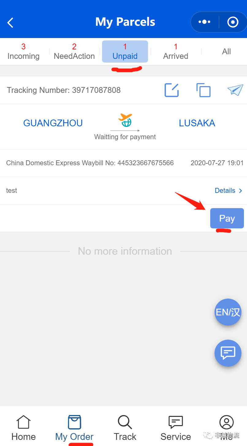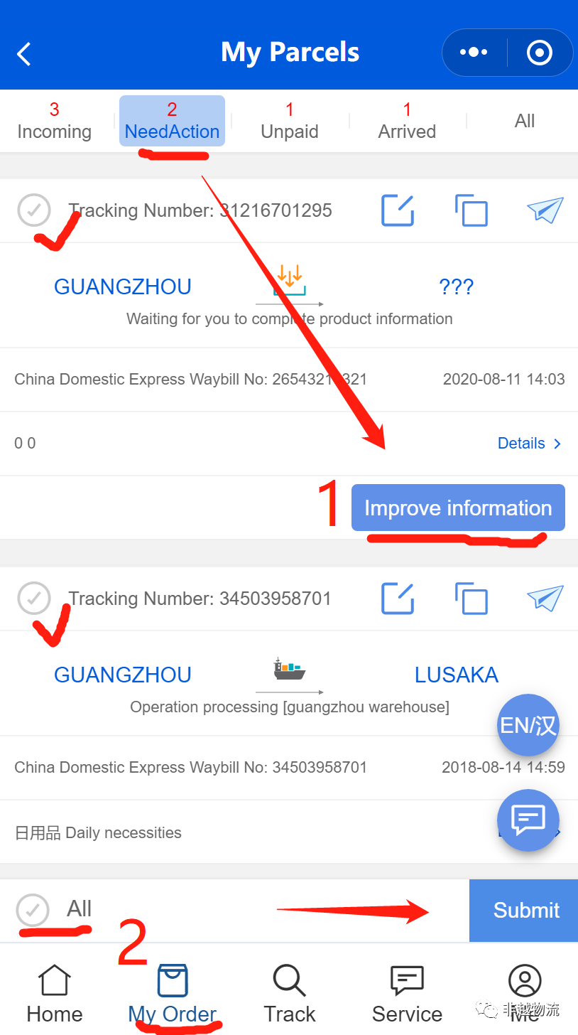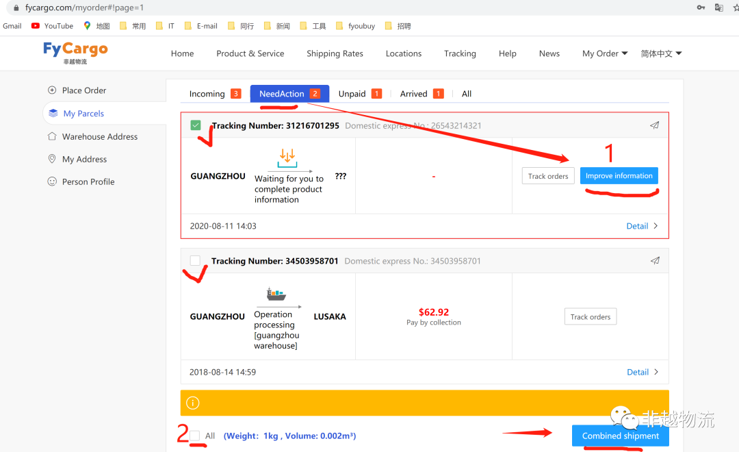 Login and Enter my account, in "my package" > "Need Action", first complete the commodity information>"Improve Information", and then select the package you want to ship or select all --- click "Submit" , fill in the address information of overseas consignees, select the mode of transportation, and select the payment method. If you need value-added services, you can choose according to your needs and submit the transfer form.