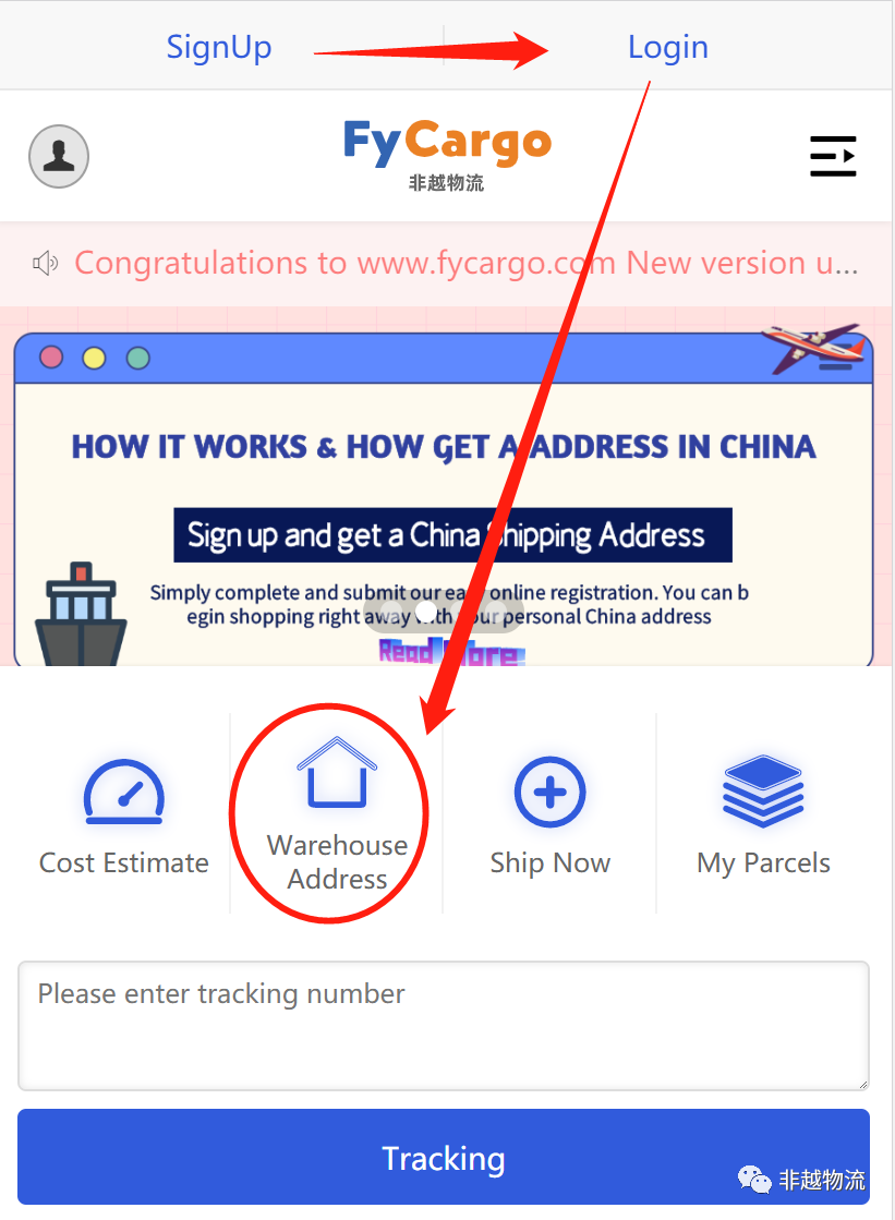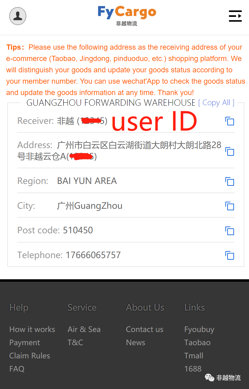 Register and Login www.fycargo.com , or FyCargo wechat program, easy access to your exclusive forwarding address, the only difference between exclusive address is with your [user short code], warehouse receipt is according to your [user short code], Each registered [user's short code] is different according to the unique short code of your registered account~ ~, very important!!!